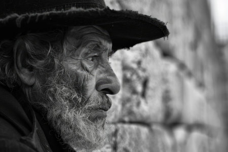 An elderly man in traditional Jewish clothing stands thoughtfully at the Western Wall in Jerusalem