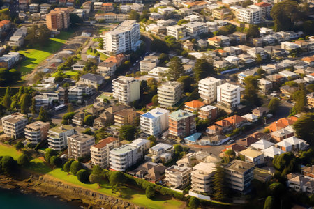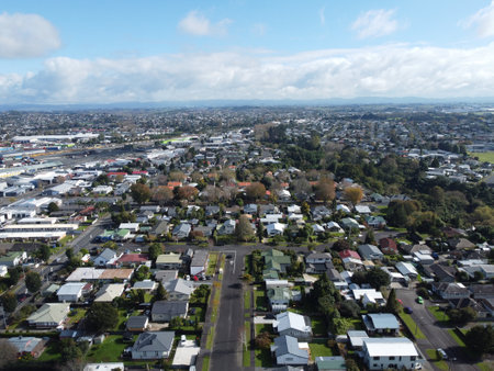 View from above of residential streets and houses in the New Zealand city of Auckland, New Zealand