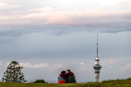 Auckland, New Zealand - September 27, 2015: Romantic coumple enjoying the beautiful sunset of Auckland, New Zealand.