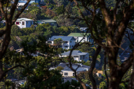 Tidy traditional villas in a fairytale-like setting between mature trees and shrubs on the steep slopes ofr green mountain. Sunny spring day in Wellington, New Zealand