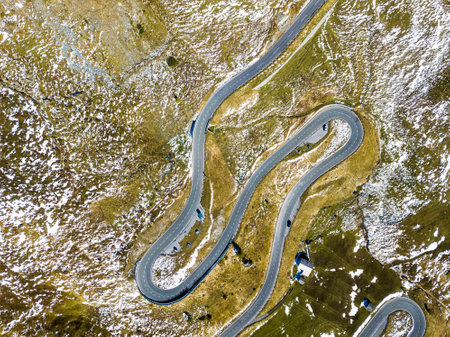 Aerial view of Grossgloknerstrasse in snow. Great high mountain road near Grossglokner mount in the Austrian Alps