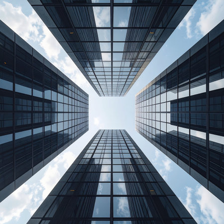 Modern skyscrapers with reflective glass facades stand tall against a misty, overcast sky, captured from a low-angle view; perfect for illustrating urban development and business environments.