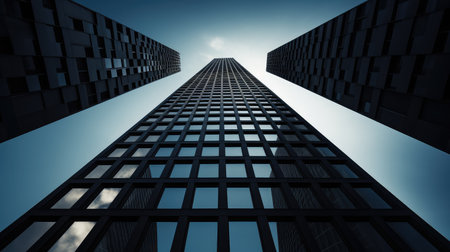 Low angle view of skyscraper with glass windows and blue sky background for business and finance concept. AI Generated