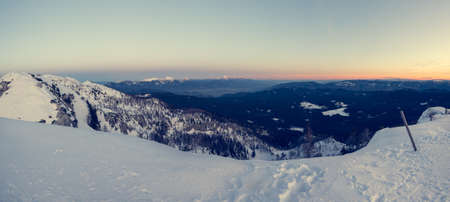 Spectacular winter mountain panoramic view of mountains at sunset.