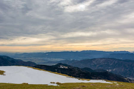 Scenic view of snow capped mountain peaks of Karawanks from Sinacher Gupf in Carinthia, Austria. Mount Hochstuhl (Stol) is visible through dense forest in early spring. Rosental on sunny day. Freedom