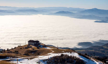 Austria, high fog over Puchberg basin on Schneeberg mountain