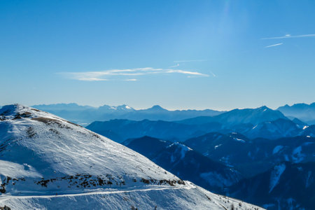 Panoramic view on snow capped mountain peaks of Karawanks in Carinthia, Austria. Julian Alps. Winter wonderland in the Austrian Alps, Europe. Ski tour, snow shoe hiking. Hochobir. Blue misty hills.