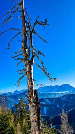 Dry tree without leaves. Ssnow capped mountain peaks of Karawanks in Carinthia, Austria. Julian Alps. Scenic view on winter wonderland in the Austrian Alps, Europe. Ski tour, hiking. Hochobir