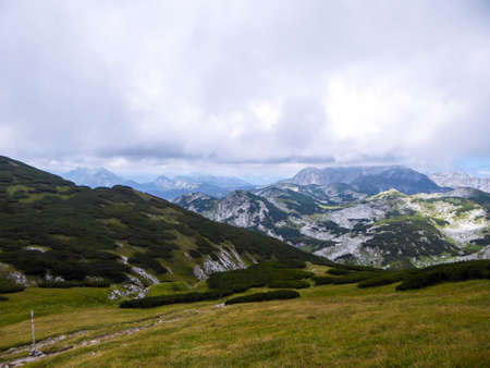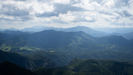 A panoramic view on the mountains in Hochschwab region in Austria. The vast plains spread along the mountain tops. Endless chains of the mountains. Overcast and cloudy day.