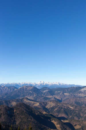 The sunny midday on Feuerkogel Mountain plateau, overlooking rocky sharp peaks of Dachstein massif, snowy slopes and spruce forests, Ebensee, Salzkammergut, Austria