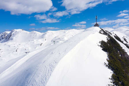 High mountains under snow in the winter for alpine skiing. Aerial view with drone.