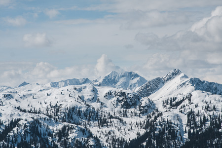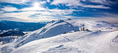 A panorama of a snow caped mountains Alps in Goldeck, Austria. Crispy and frosty morning. The ground is completely covered with snow. Endless mountain chains in the back. Serenity and solitude