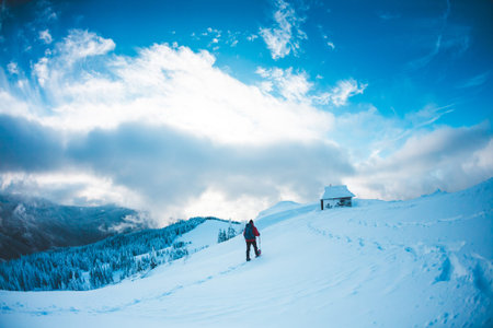 A man in snowshoes and trekking sticks in the mountains. Winter trip. Climbing climber against the background of sky with clouds. The tourist found shelter. House in the mountains. A hut in the snow.