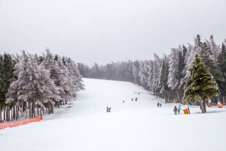 Beautiful view from the watchtower lost in the frozen forest covered in white snow during winter in Czech Republic nature park.