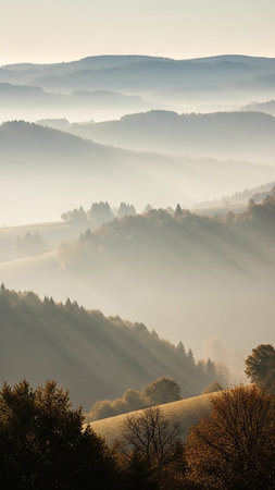 Layered misty mountains with sunbeams breaking through the fog illuminating autumn trees and rolling hills in a serene landscape.