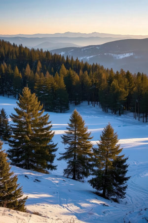 Sunset in the winter coniferous forest. Beautiful winter landscape.