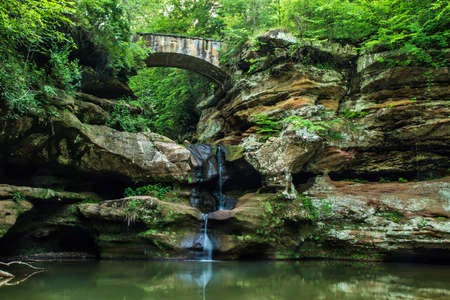 The Enchanted Forest Waterfall. Ancient stone footbridge crosses over a ravine with a waterfall flowing into a natural lagoon. Hocking Hills State Park. Logan, Ohio.