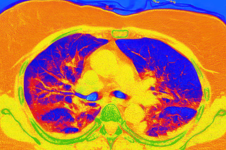 Human lungs with COVID-19 pneumonia, color-enhanced CT scan showing normal lung tissue in blue and affected bilateral areas with ground-glass opacities and crazy-paving patterns in orange-red.