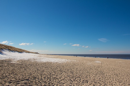 Dune scene with beach grass and snow along a North Sea beach on Sylt island, Germany