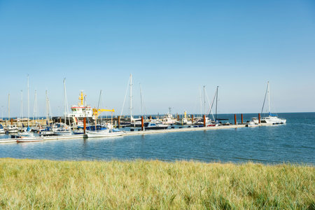 Fishing Boats and Yachts Are Moored at the Marina by the North Sea, Surrounded by Green Grass Under Radiant Blue Sky, Indicating a Pleasant Day for Maritime Activities.