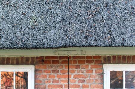 Specific Frisian building with red brick wall and thatched roof and bloomed flowers and poppies in front of the house. Selective focus rustic image.