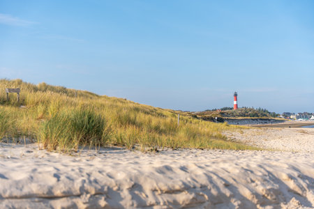 Small white lighthouse on a hill with beach grass on Sylt island, Germany