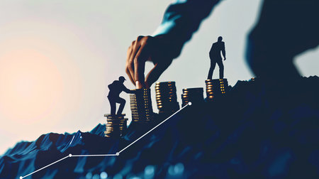 Miniature people. Climbers are climbing coins. Success business concept. business concept. Generative AI