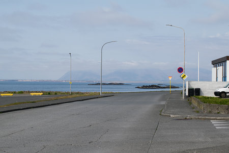 A serene coastal street scene in Akranes, Iceland, featuring the ocean and mountains.