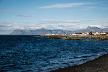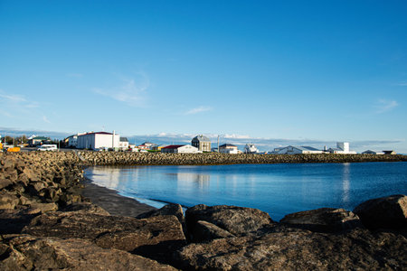 Picturesque Icelandic waterfront town with blue sky and a tranquil seaside scene.
