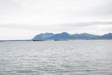 Panoramic view of ocean waters and mountain range under a cloudy sky in Iceland