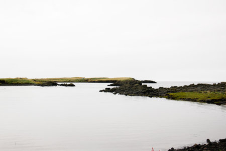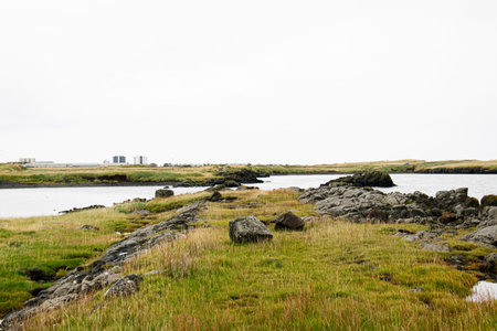 Grassy terrain by Icelandic rocky shore, overlooking a calm body of water and skyline.
