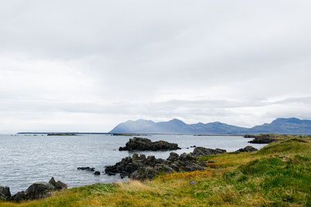 Scenic view of Icelandic coast with rocks, grassy shore, and distant mountain range.