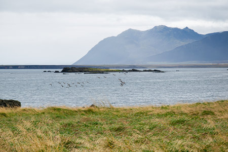 Coastal view of Iceland featuring mountains, a serene sea, and flying birds.