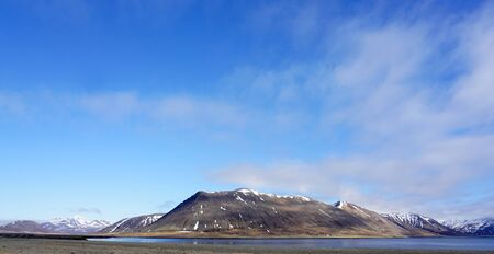 Beautiful snowy peaks of Icelandic mountains on the other side of the lake. Beautiful coast line and reflection of the sky and mountain tops in the water.