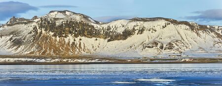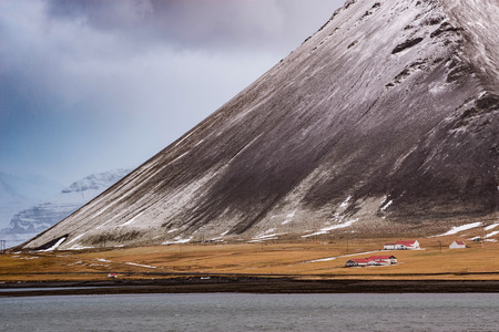 Icelandic landscape with a white small beautiful house in winter under the mountain at Arnarstapi village snaefellsness peninsula, Iceland