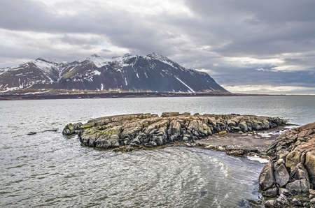 Atlantic Ocean with snow capped mountains and Icelandic Landscap