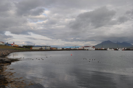 HUSAVIK, ICELAND - JUNE 17, 2016: View of the fishing harbor of Husavik, northeast Iceland