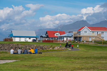 Hornafjordur Iceland - August 01. 2018: Tourists enjoying the good weather in town of Hofn in Iceland