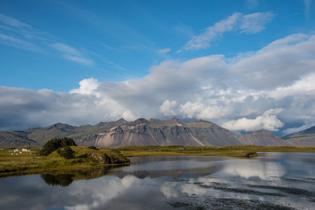 Colorful Icelandic landscapes under gray heavy sky. Green wet grass, beautiful lake, and snowy tops of the mountais reflected in the lake water. Kirkjufellsfoss, Snaefellsnes peninsula.