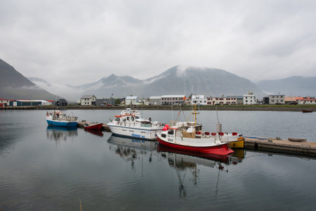 Small harbor with fishing boats in Iceland with rain and fog. In the background is a typical mountain in the fjord.
