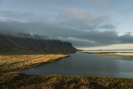 Stokksnes, Iceland with Vestrahorn mountain obscured by clouds and water in the foreground.