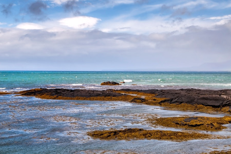 Low rock formation on the shore at the town of Borgarnes, Iceland, with a view towards the fjord, the snow-capped mountains and the ocean beyond
