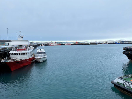 HAFNARFJORDUR, ICELAND - July 16, 2021: Hafnarfjordur fishing harbour - small boats and colourful port buildings. Stormy clouds on the sky.