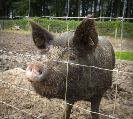 Muddy pig stares, farm background, rural scene, food