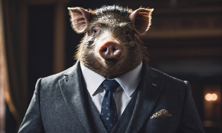 A pig in a suit stands in a dimly lit room, looking out of the frame