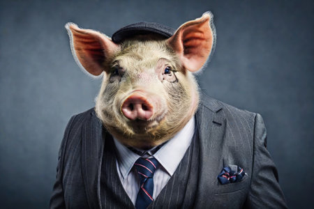 Pig in business suit and cap on dark background