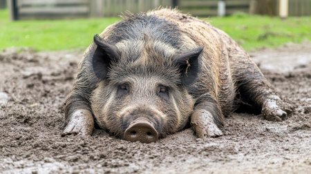 A relaxed pig lies in a muddy farmyard, showcasing its sturdy build and peaceful demeanor. The natural setting highlights the charm of farm life.