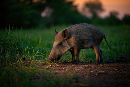 A captivating image of wild pigs roaming freely during a stunning sunset. The scene captures the beauty of nature and the vibrant colors of the environment.