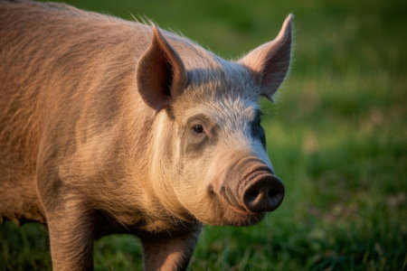 Portrait of a pig on a meadow in the morning light