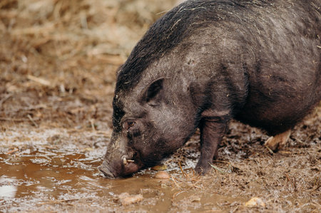 Portrait of a young pig in the mud in the paddock